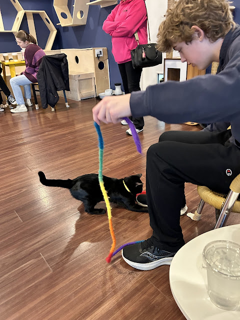 This little one might have been our favorite. Most of the cats at Bertha's Beans Cat Cafe are up for adoption! Grant wants a cat so bad, but his dad is allergic (wah wah wahhhhh....)